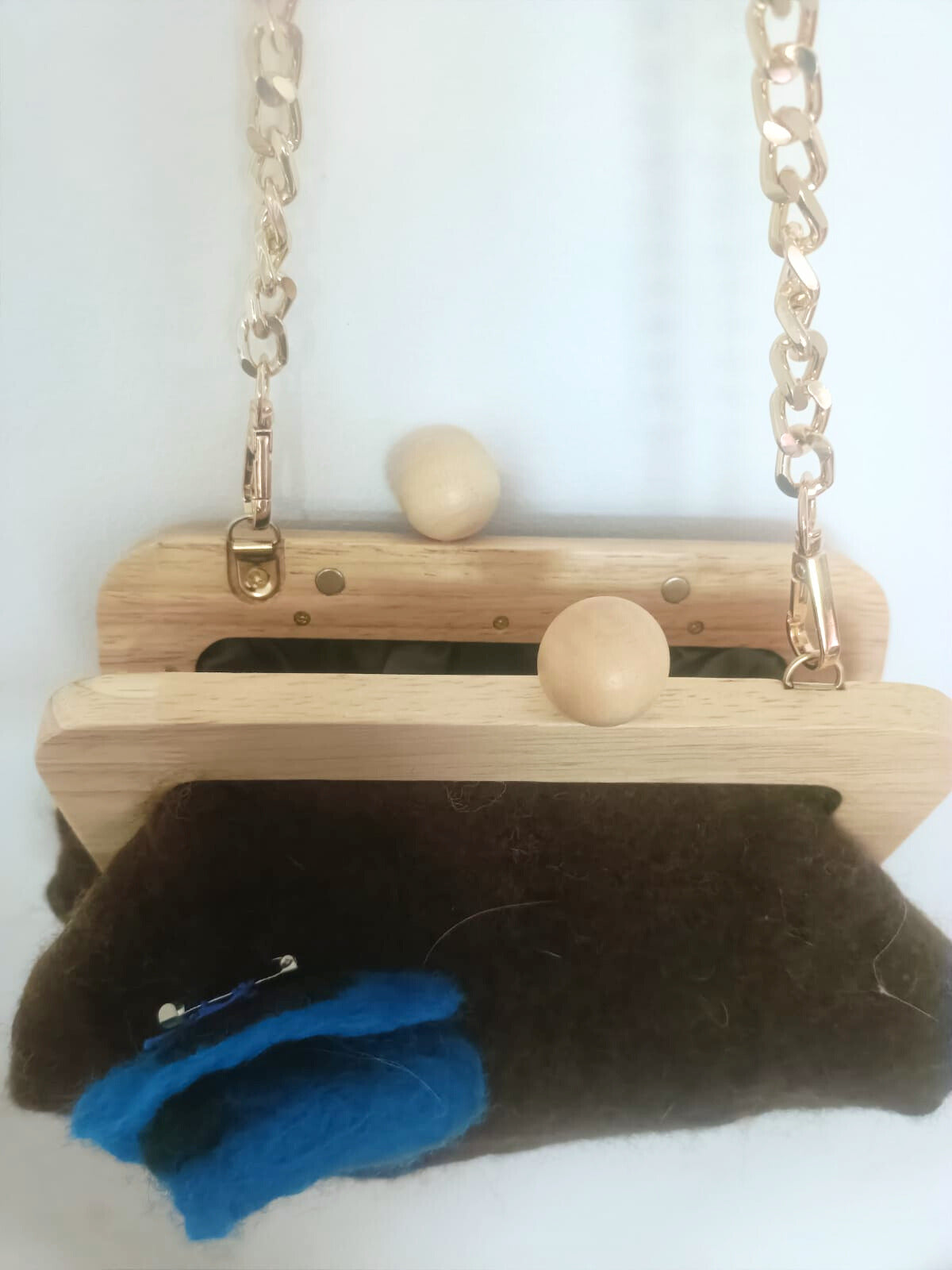 Bolsa artesanal confeccionada en lana merino 100% de peso ligero, ideal para el día a día. Cuenta con asas de madera natural que aportan elegancia y durabilidad. Diseño completamente hecho a mano que refleja nuestro compromiso con la sostenibilidad. Incluye un broche decorativo en forma de rosa con tonos marrón y azul, desmontable para utilizarlo como accesorio independiente en tu bolso o como cierre funcional. Pieza única que combina artesanía tradicional con practicidad moderna.